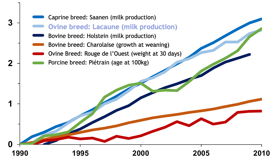 The success of the Lacaune genetic programme has resulted in the breed becoming by far the most popular in France. 800,000 ewes are milked, and several hundred thousand are actively involved in multi-herd evaluation and selection. By comparison, the total number of East Friesian ewes milked in Europe is measured only in tens of thousands.